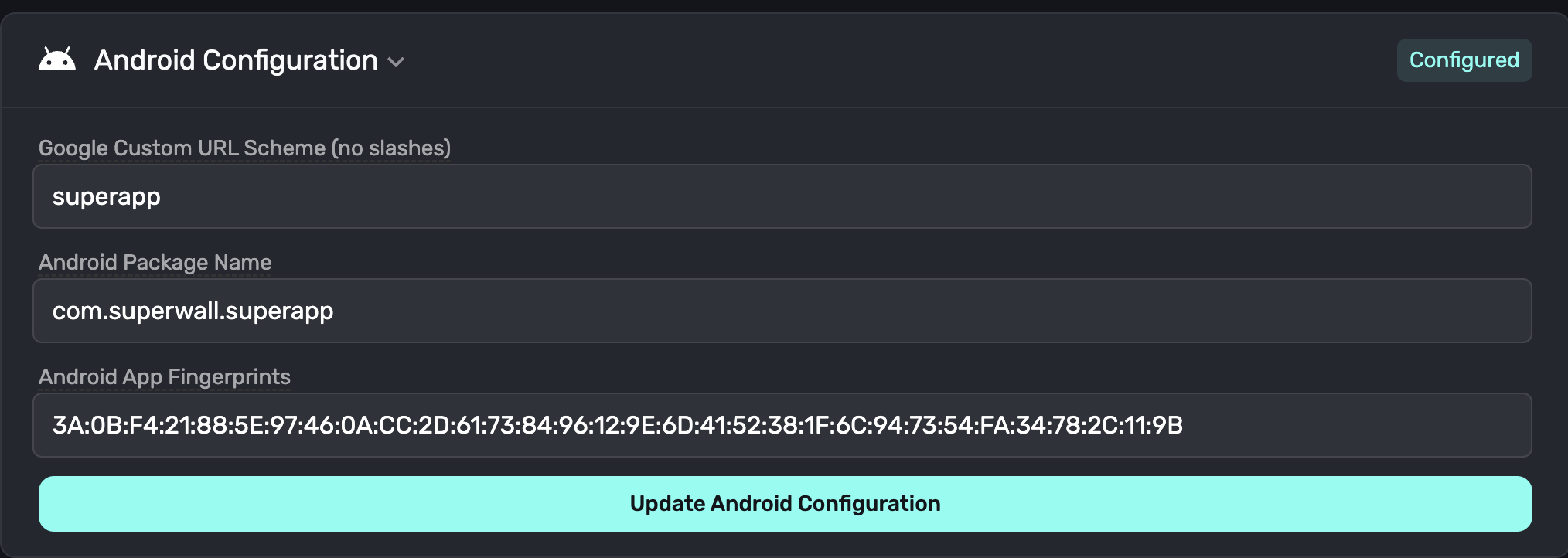 To add the fingerprints to Superwall, open the Settings tab of your Superwall Stripe application. Under the Android Configuration title, you should see three fields: