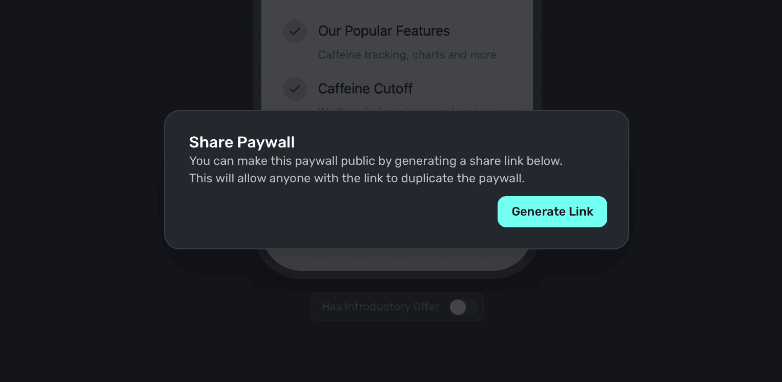 Clicking the share icon allows you to share your paywall externally. This is useful for sharing with your team or clients. Once you click on share, you'll be prompted to generate a link: