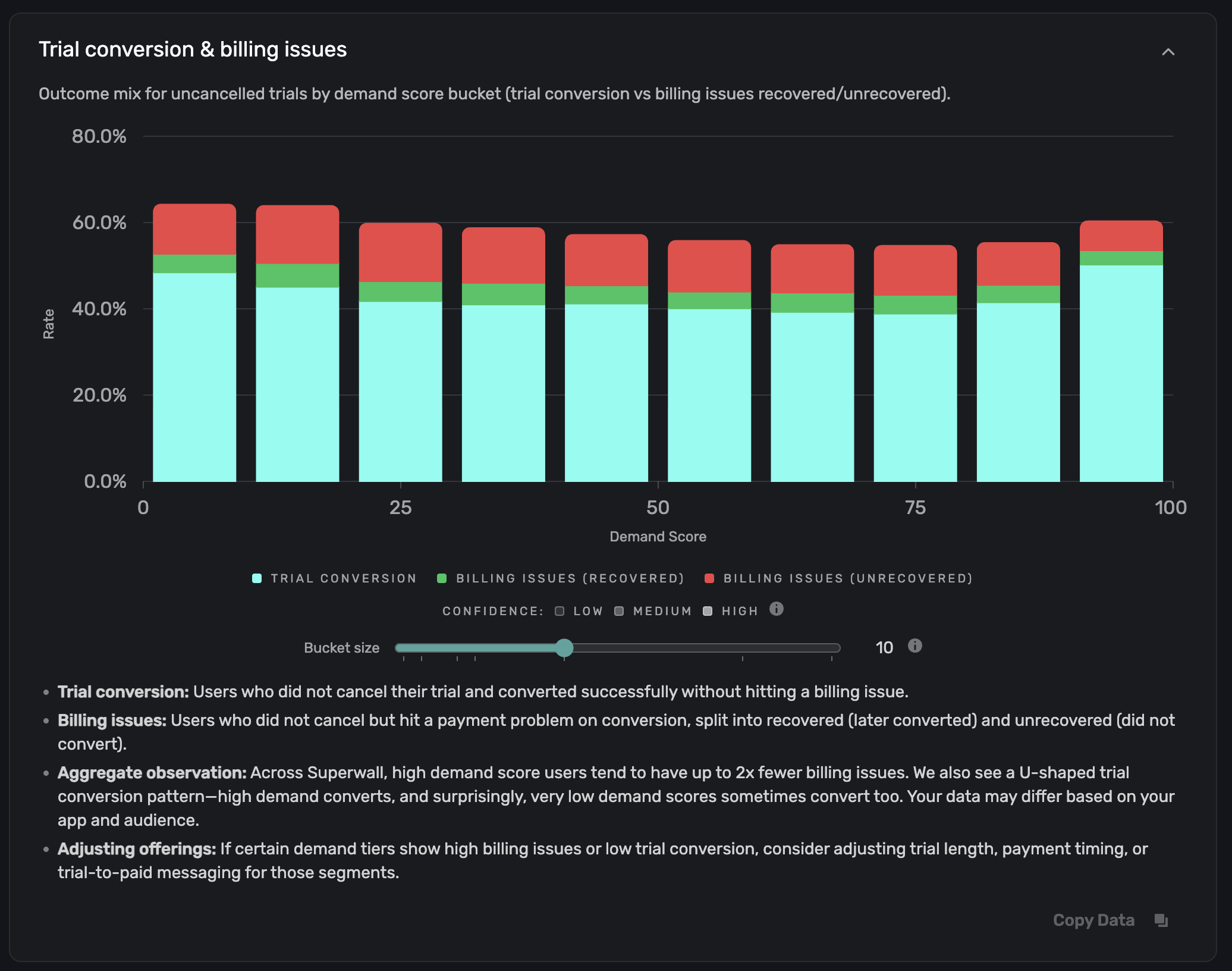 The Conversion Rate chart shows the observed conversion rate for each demand score bucket. Higher-demand buckets should generally have higher conversion rates. If they don't, it may point to a paywall or offer issue in that range.